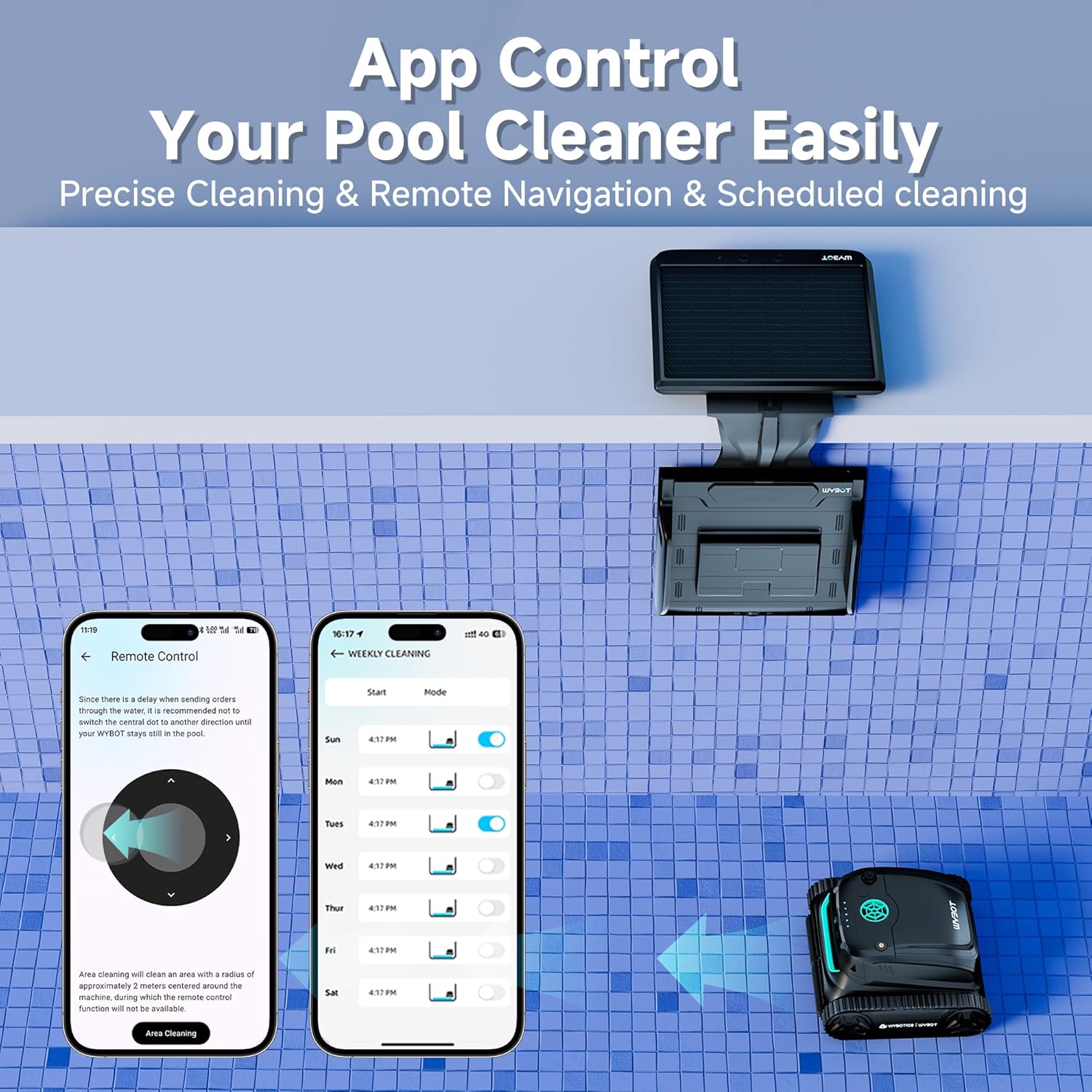 Application Mobile Wybot : Connectez votre robot en Bluetooth ou WiFi. Programmez vos cycles, choisissez parmi 8 modes de nettoyage (Mode Éco, Turbo, Expert…) et recevez des mises à jour logicielles (OTA) pour améliorer ses performances.