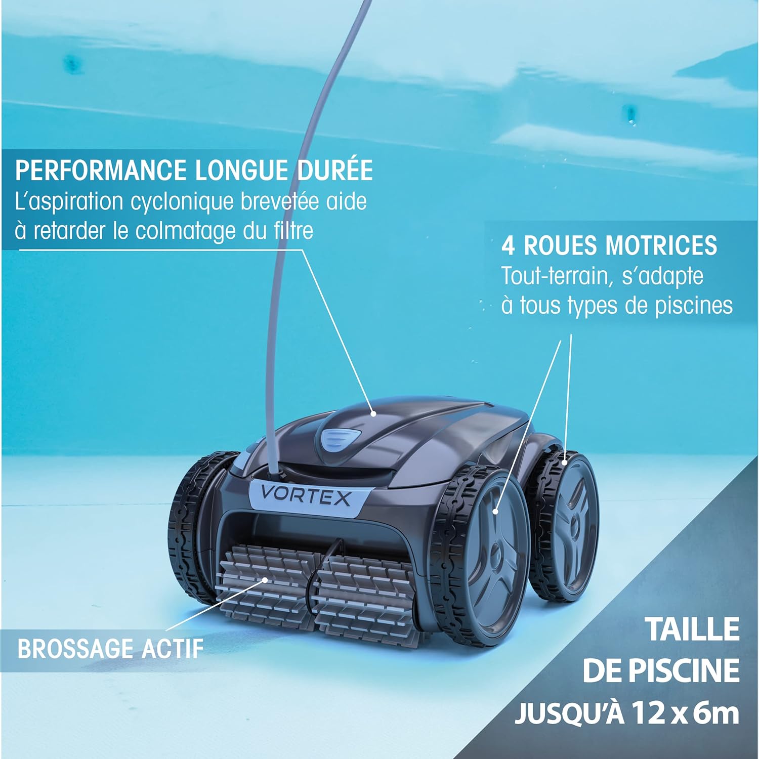 Le robot piscine Zodiac OV 5200 est doté d’une technologie cyclonique puissante, qui assure un nettoyage complet du fond, des parois et de la ligne d’eau. Cette technologie crée un cyclone à l’intérieur du filtre, garantissant une performance durable et efficace. Le robot offre deux cycles de nettoyage au choix : un cycle de 1h30 pour le fond uniquement, et un cycle de 2h30 qui inclut le fond, les parois et la ligne d’eau. Cela vous permet de sélectionner facilement le cycle le plus adapté à votre piscine.